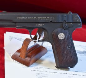 MON NOV 3, ULTRA RARE & RABIDLY DESIRABLE, US WWII BLUED 1903 COLT POCKET HAMMERLESS PISTOL, “US PROPERTY” VERY EARLY JAN,1942 SHIPMENT, WB CARTOUCHED, VERY SHARP!