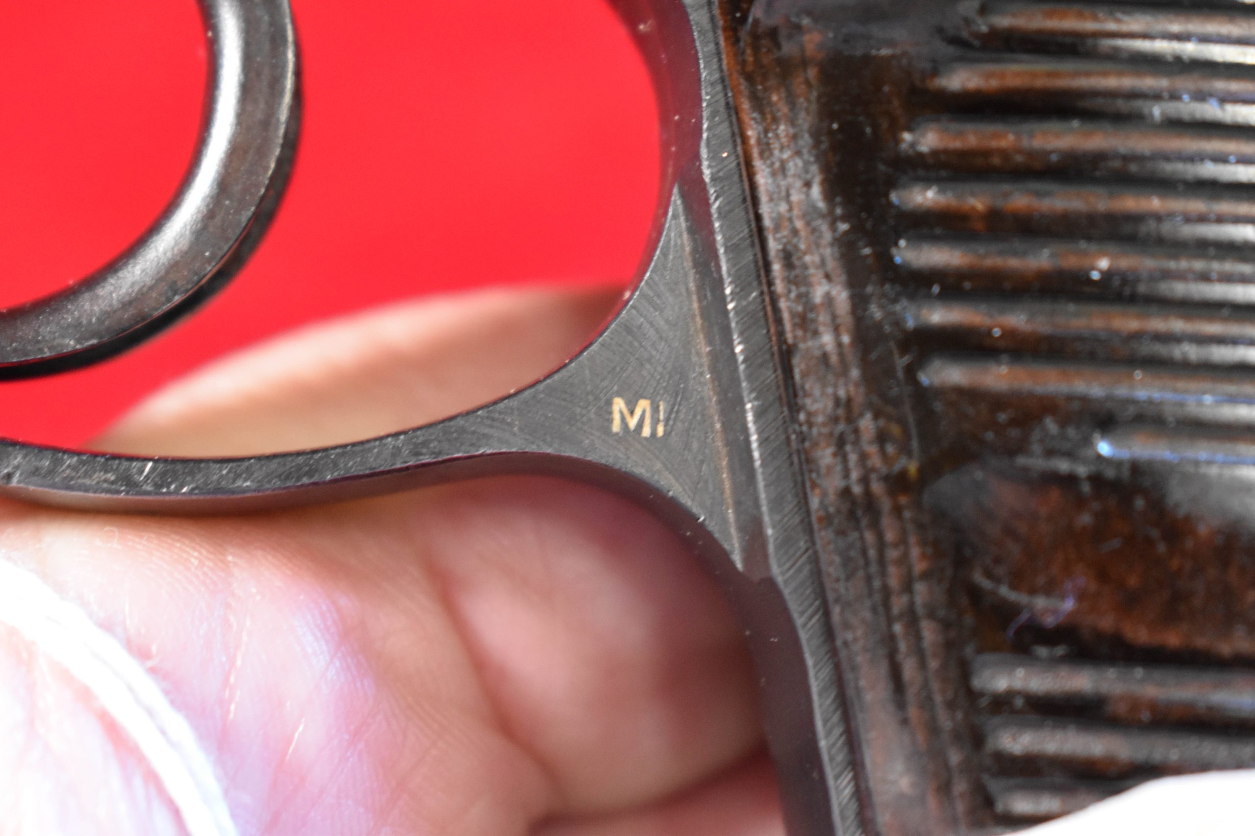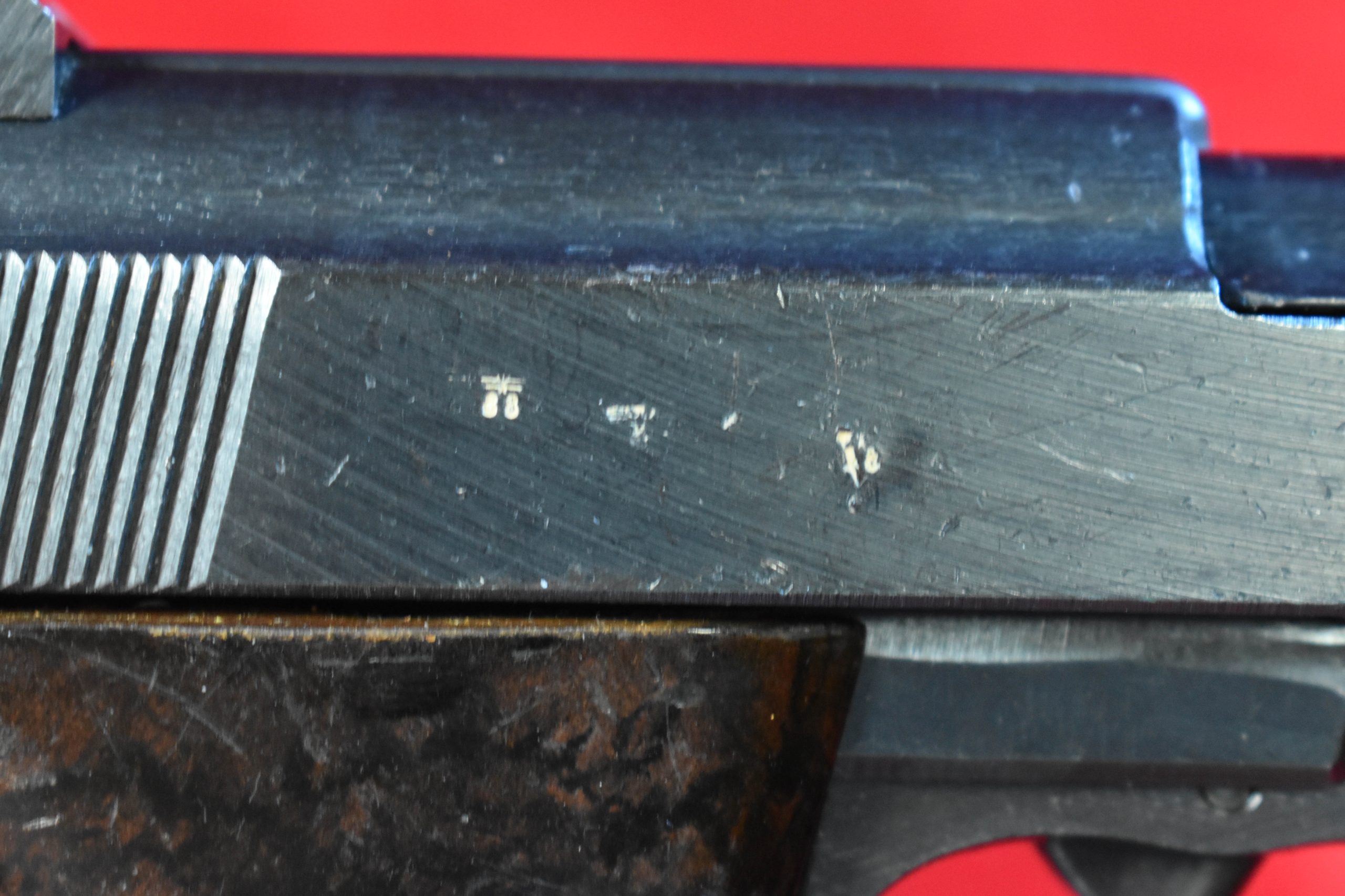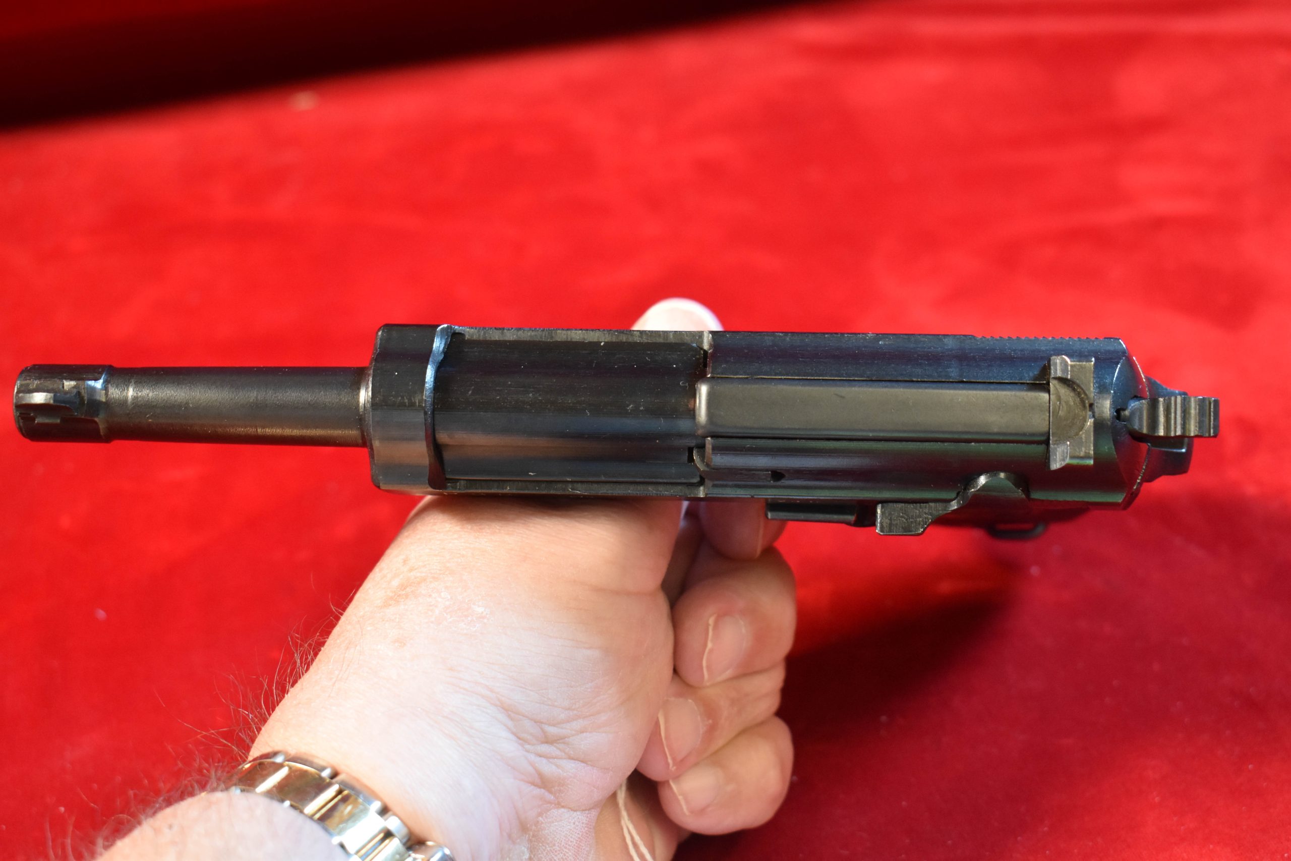 In 98% mint very roughly made condition we haves one of the rarest variants of the Spreewerke made P.38 pistol, a late 1944 production “x” block pistol that was assembled with and FN made e/140 and MI marked Frame. It is estimated that only around 1400 cyq pistols were assembled with an FN frame making them unbelievably rare and the chance of obtaining one nearly unique. This is an all matching textbook example with a decent but not mint bore. The rarity of this pistol and the desirability among advanced P.38 collectors cannot be overstated. If you are looking for this variant to fill a hole you should move fast.