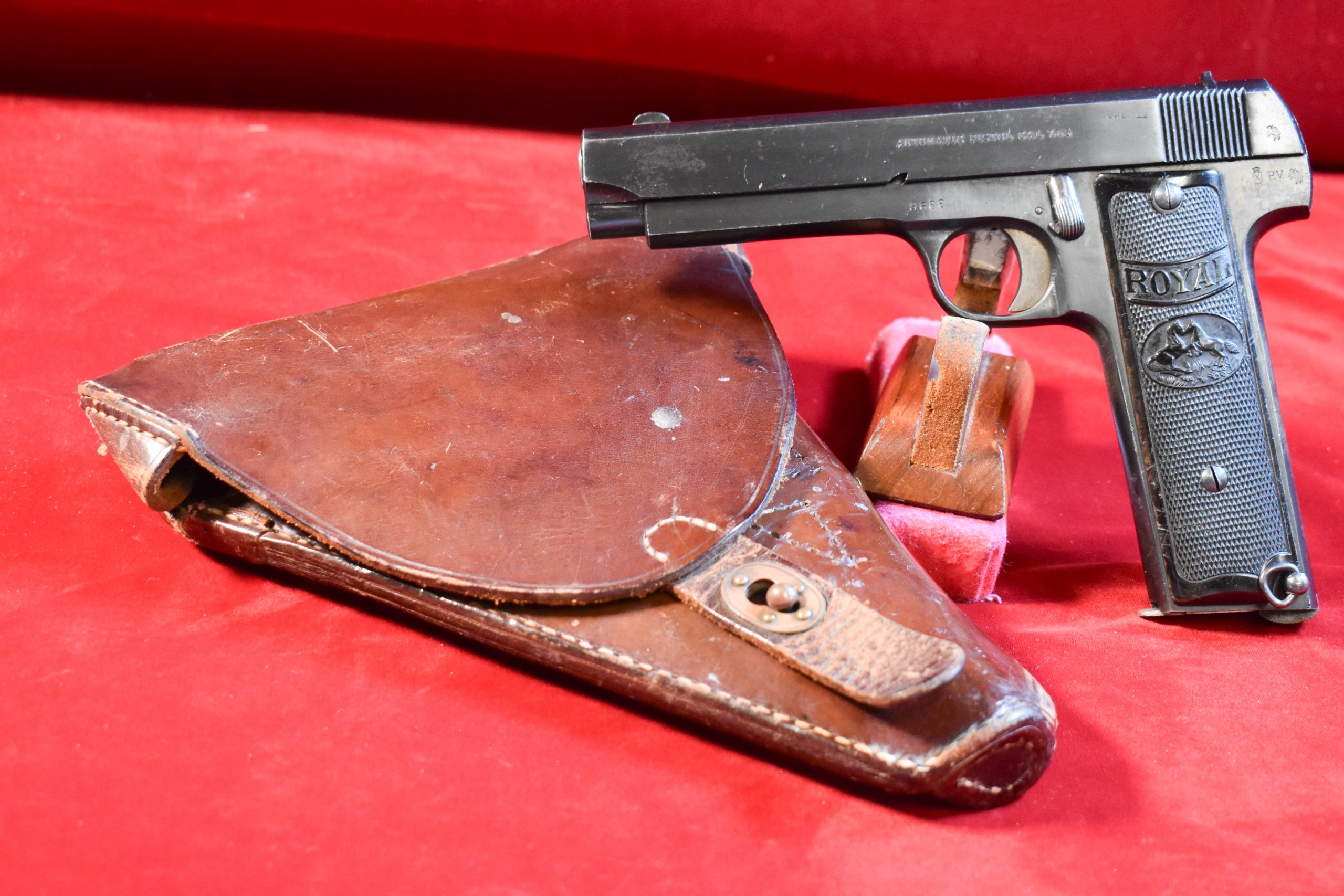 In 96% very clean condition with super nice grips, we have a rarely seen Japanese Issued Spanish made Royal Pistol with a rare Japanese modified Type 14 Nambu holster to fit it, with a completely new flap added. These high capacity large overgrown Ruby type pistols were sold to the Japanese, in fact there is a Famous picture of a Japanese Pilot carrying one of these pistols. They are never found in this fine condition let alone with a holster. This is a REAL FIND FOR THE JAPANESE PISTOL COLLECTOR! YOU WILL NEVER FIND A HOLSTER FOR THIS PISTOL.