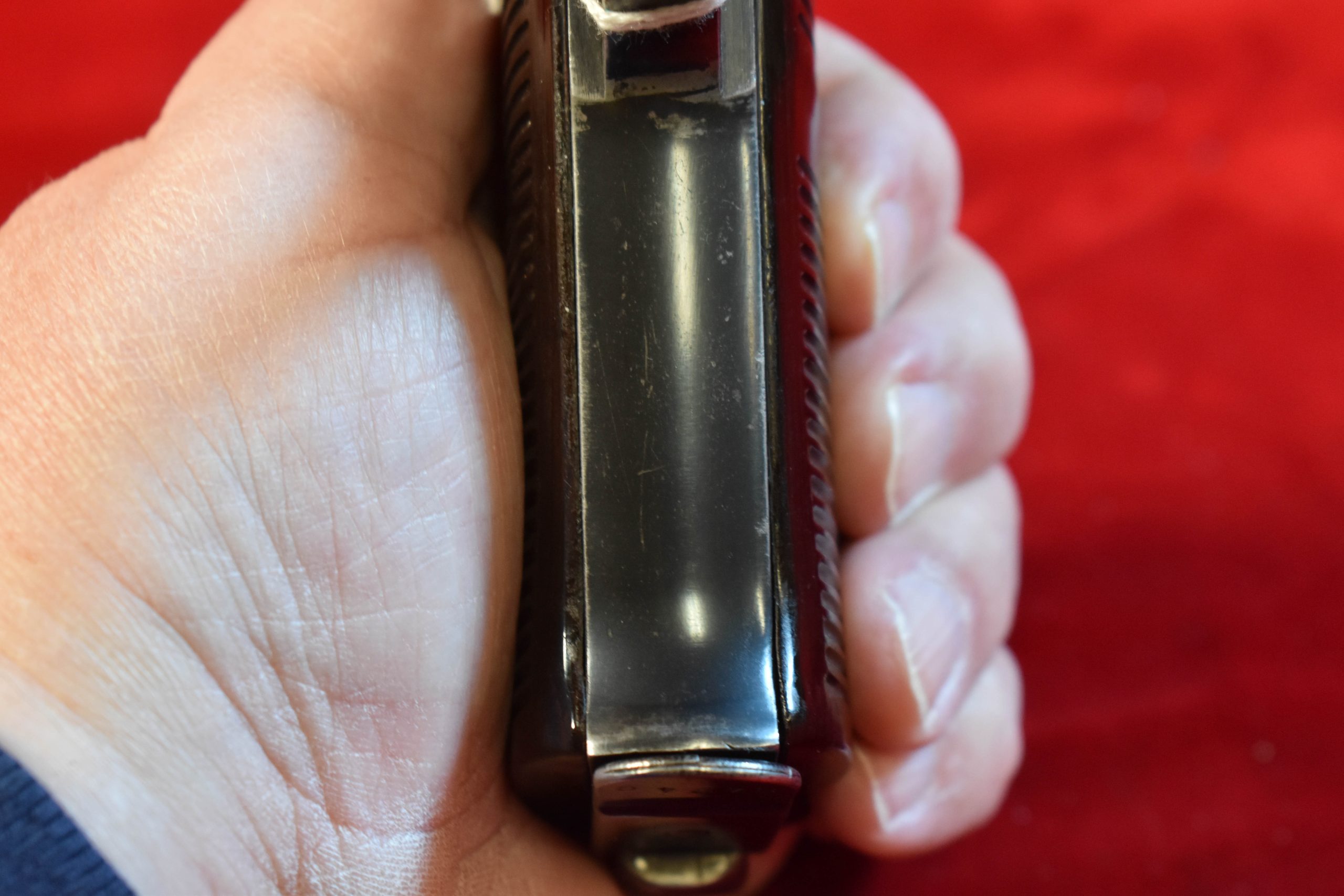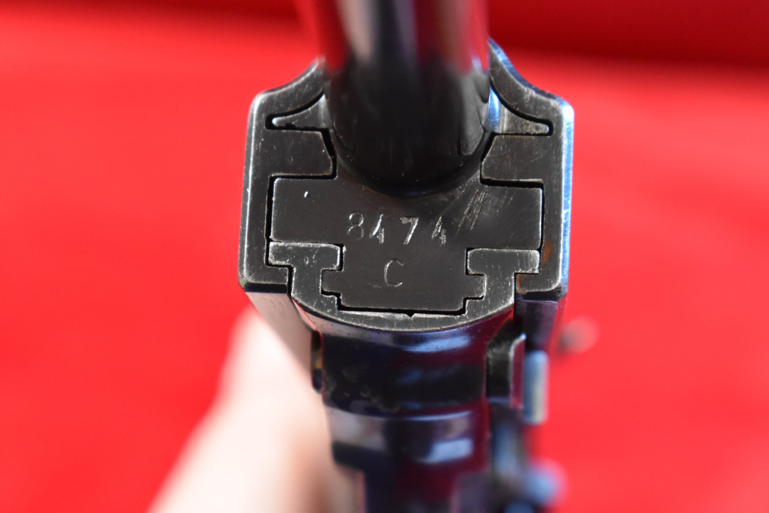 In 97% very sharp all matching condition, including the magazine, we have a very hard to find 1941 Walther ac 41 coded P.38 Pistol. This “c” block pistol is an early 2nd sub-variation with the polish commercial grade finish. The magazine is factory original and is matching to the pistol which is a big deal. The bore is mint and this thing really pops!!! This is a textbook example of an early 1941 Production P.38 and would be an important addition to any serious collection. These early production pistols that still have matching mags are very hard to locate in this top condition. the bore is mint and the de-cocker works just fine.