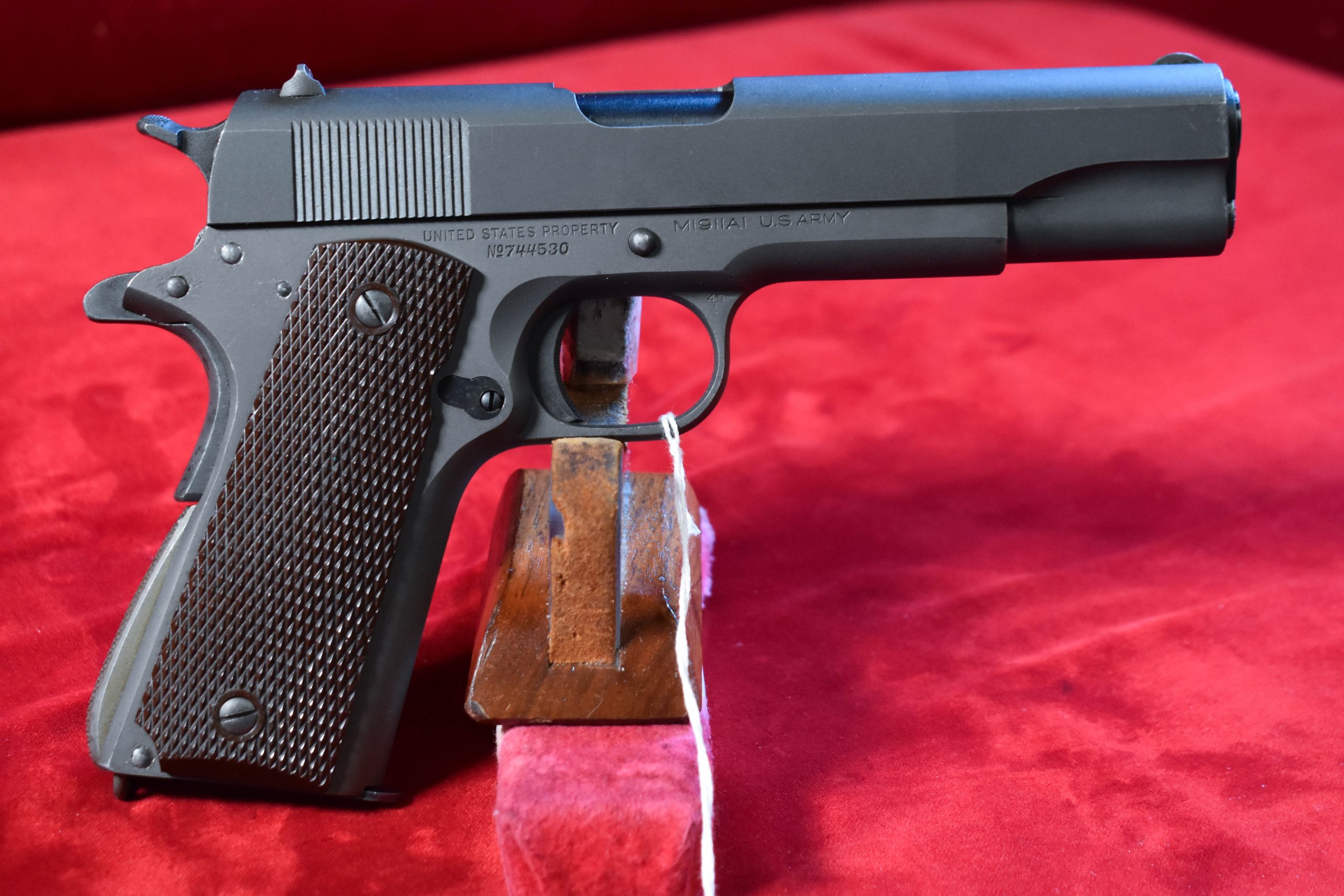 In 98%++ mint crisp stunning condition, we have a top example of a pre war Colt 1911a1 US Army Service Pistol. This pistol was shipped to Springfield Armory on Oct 20 ,1941 just 6 weeks before the Japanese Attack at Pearl Harbor. This pistol is 100% factory original; the slide is matching, it has the correct Colt hollow back grips and the small G Colt marked barrel that has a mint bore. It would be very tough to find a better example.