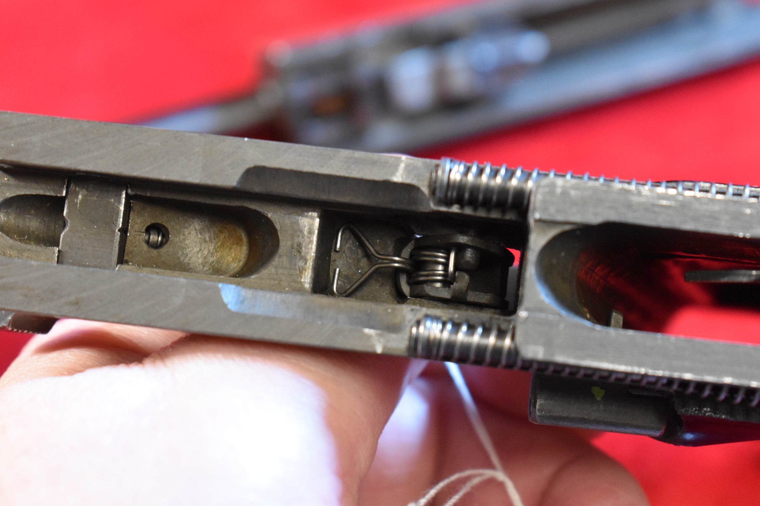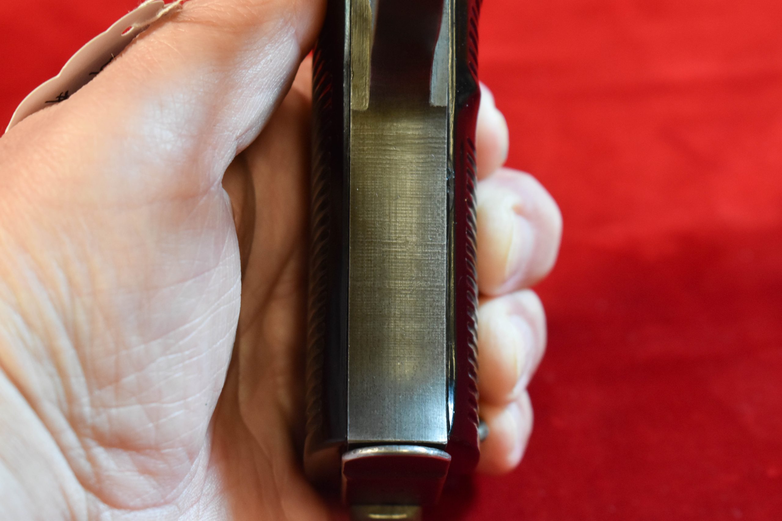 Collectors call these pistols “dual tone finish” because they are found in various combinations of a mix of blued and phosphate finished parts. The color of the phosphate can range from a very light gray to a dark gray to a very greenish gray. This example has the dark gray slide and light gray frame and a blued barrel. The color combination of this example is considered by collectors to be among the rarest and most avidly sought after.