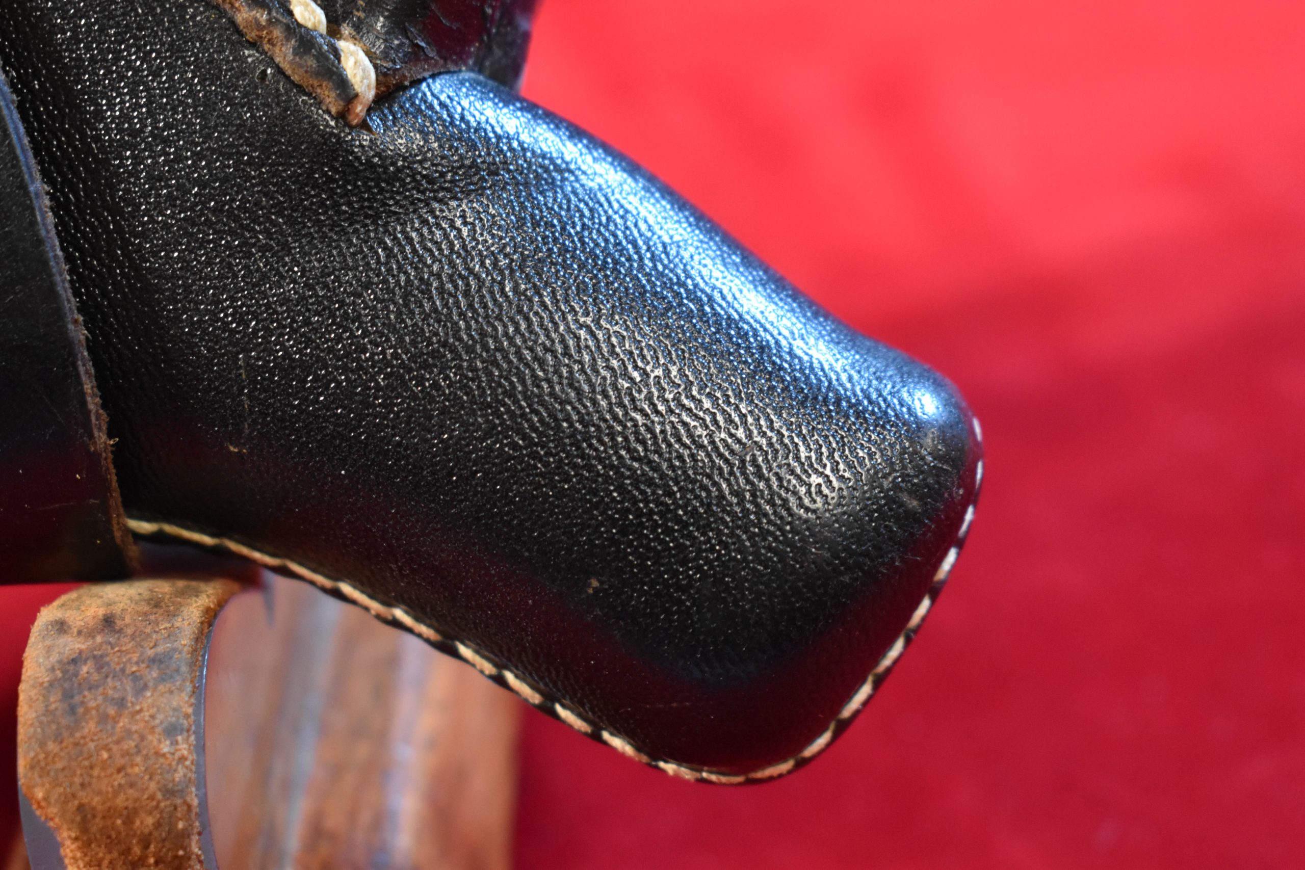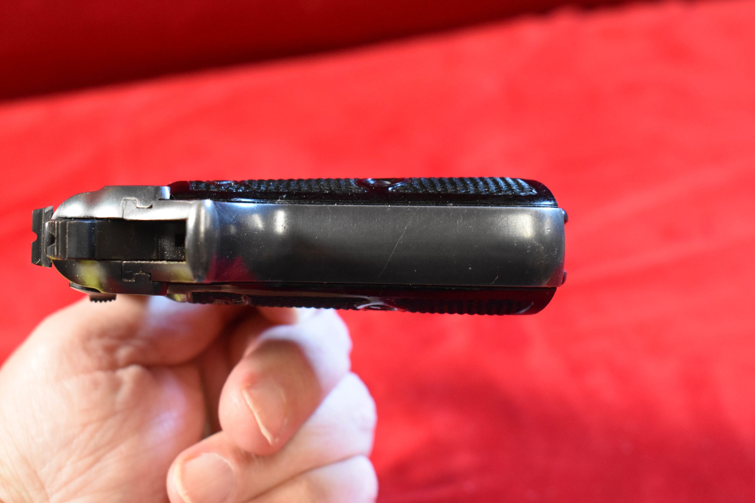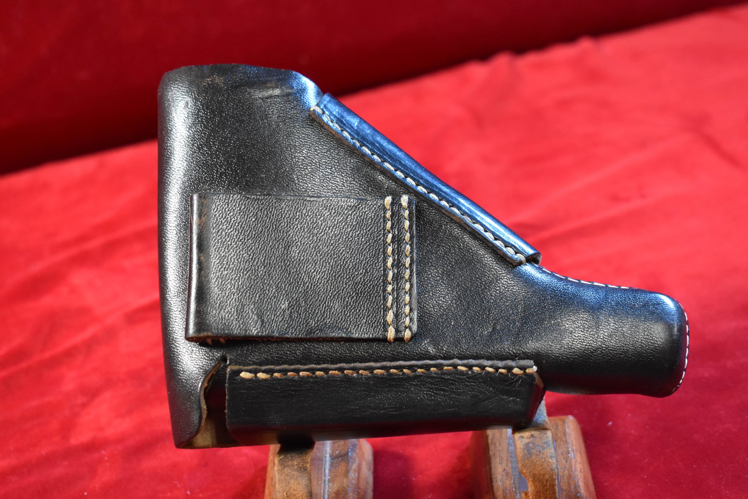 In 99% mint new probably unfired condition, we have a fairly scarce 1942 production, High Polish Wartime Eagle N proofed Walther PP pistol in .22lr caliber with an AWESOME Akah made patterned leather leading edge holster in nearly new condition as well, still with the original Bringback paper!