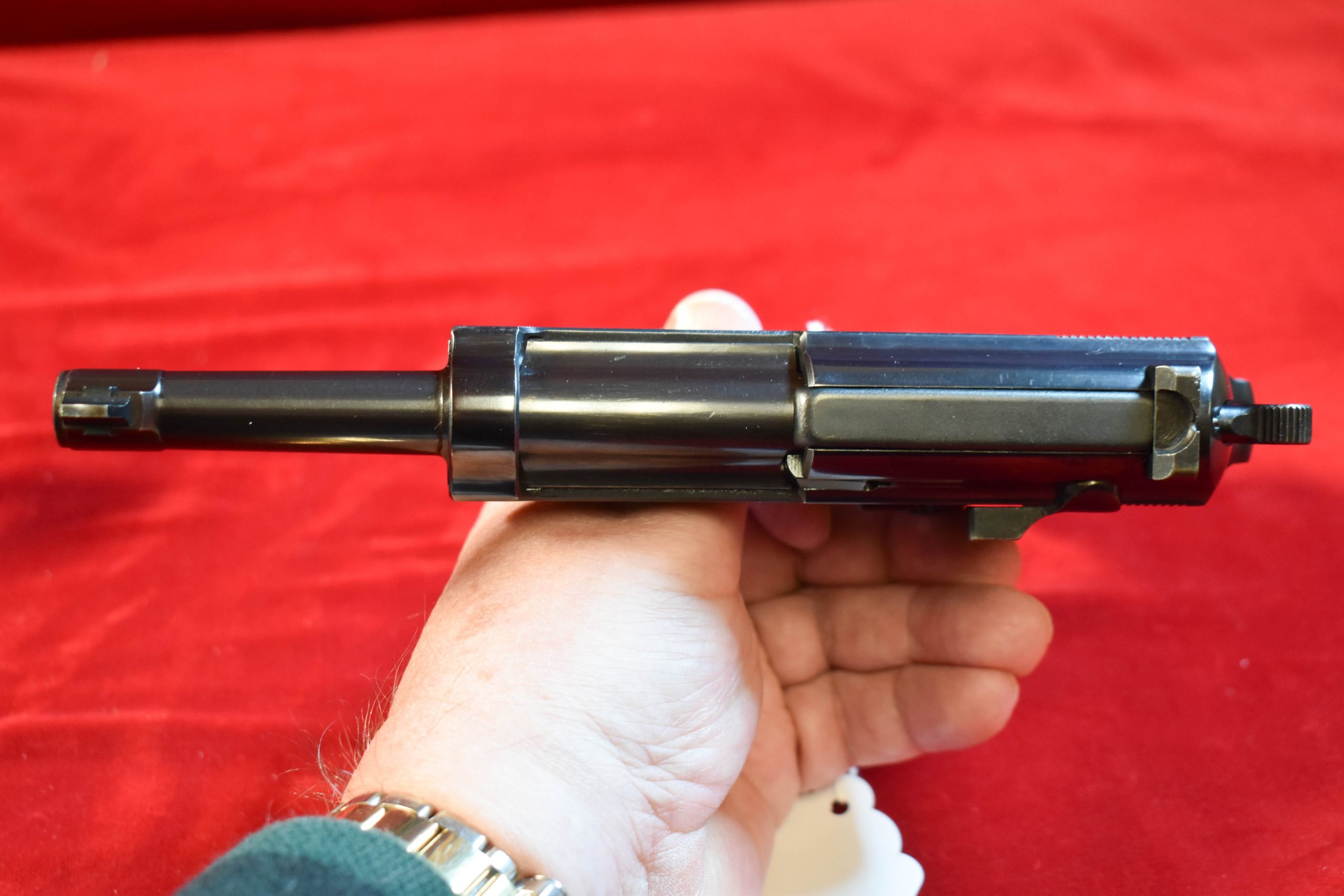 In 98%+ MINT STUNNING BEAUTIFUL  condition, we have a very scarce and seldom seen Walther Heeres Pistole from late 1940.  The best part about it is that the very beautiful high grade commercial Walther blued finish is nearly all intact, making for a visually stunning Pistol.  The pistol is all matching with a mint bore and it is a textbook example.   This is an extremely rare P.38 Variant that many people will want to have in their collection.