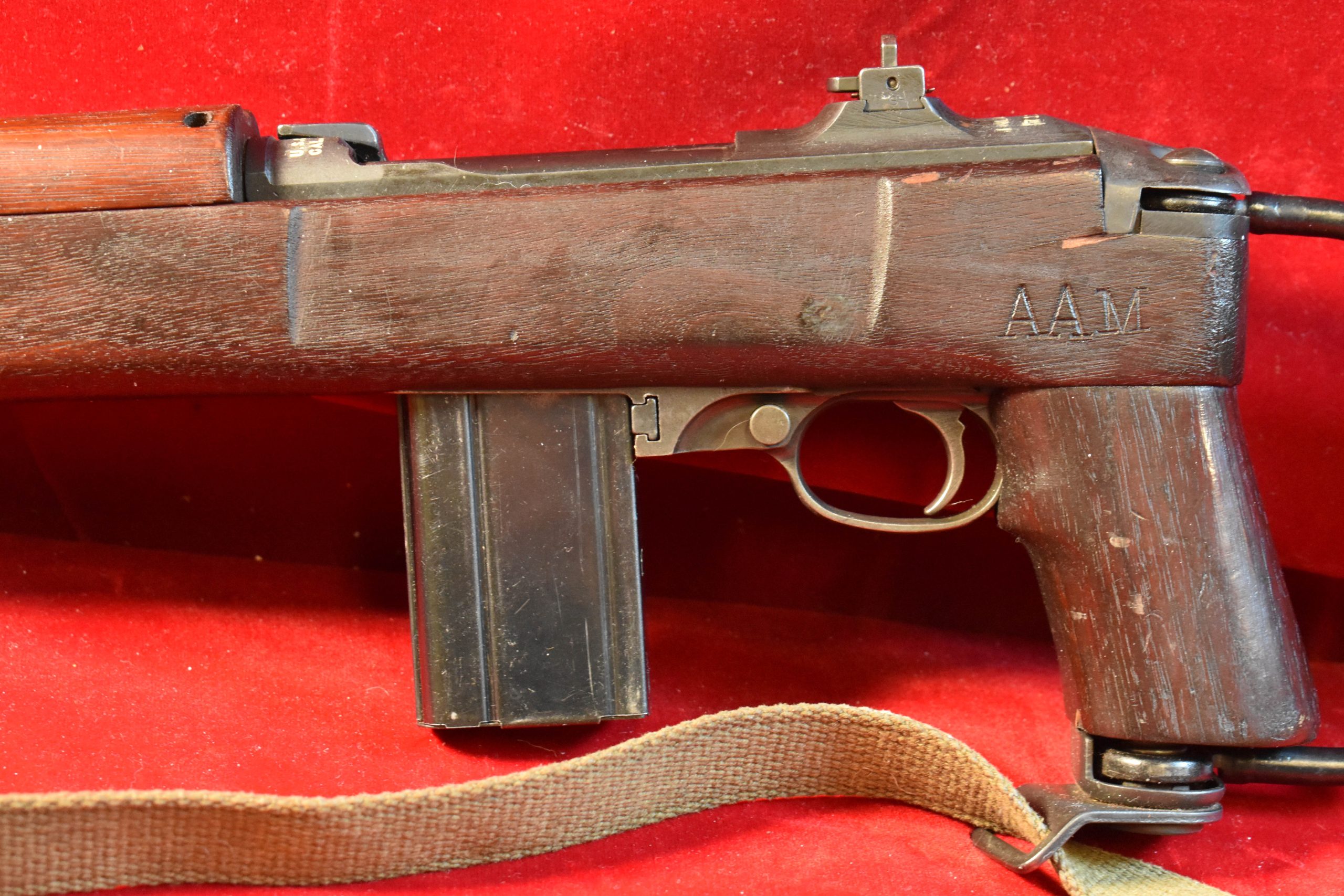 In arsenal rebuilt condition we have a March, 1943 production Inland made M1A1 Paratrooper Carbine. This carbine was likely an immediate post war upgrade with the rebuild cartouche (AAM) on the stock and the original ordnance cartouche is still present on the bottom of the pistol grip and the P proof on the back of the stock. This is a factory original M1A1 carbine that was probably upgraded and re-parked, probably in the immediate post war period at a US depot as there is a P proof on the front grip strap. The bore is mint and the rifle does not appear to have been little used after the rework . This is a great example of a type I paratrooper carbine in post war configuration. These rifles were in US service well into the Vietnam War and this is great example. If you are looking for an example of an M1A1 Carbine for your collection an don’t want to pay a price that is rapidly approaching 10k for an original condition example this is a great choice.