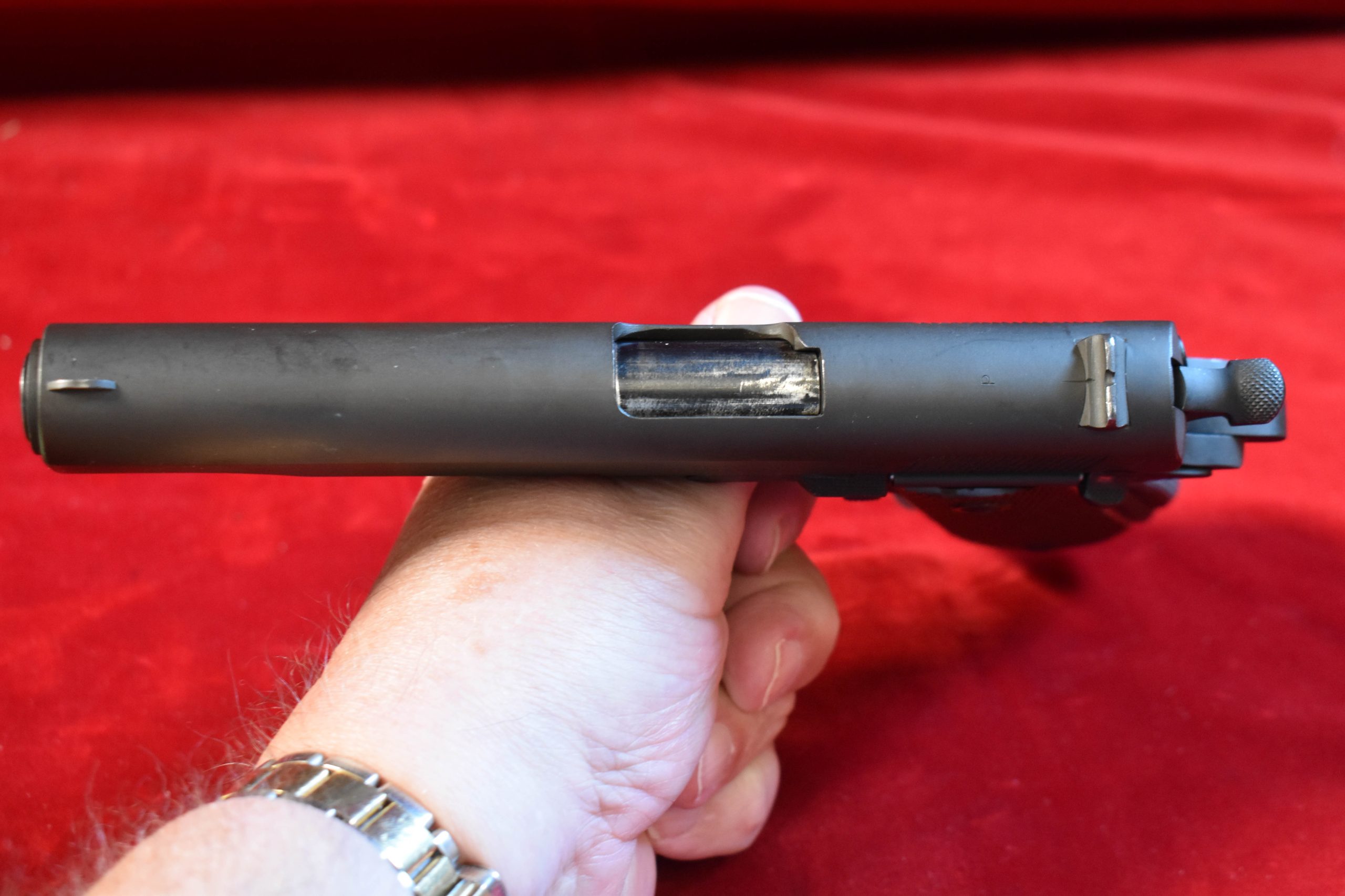 In 98%+ mint crisp 100% correct condition, we have a September,1942 production “WB” cartouched Colt model 1911A1 US Army Service Pistol. This is what everyone thinks of when they think of a WW2 Colt 1911a1 pistol, indeed when Colt made their WW2 reproduction a few years back they copied it after an early 1942 production Waldemar Broberg inspected pistol. This pistol was shipped from Colt’s to Springfield Armory in September, 1942. The pistol is 100% correct and factory original, the barrel is the correct “large G” marked barrel with a mint bore and the slide is numbered to match the frame. Everything on this pistol is original exactly as it left the factory. This pistol is an exceptional textbook example of an Early wartime production Colt 1911a1.