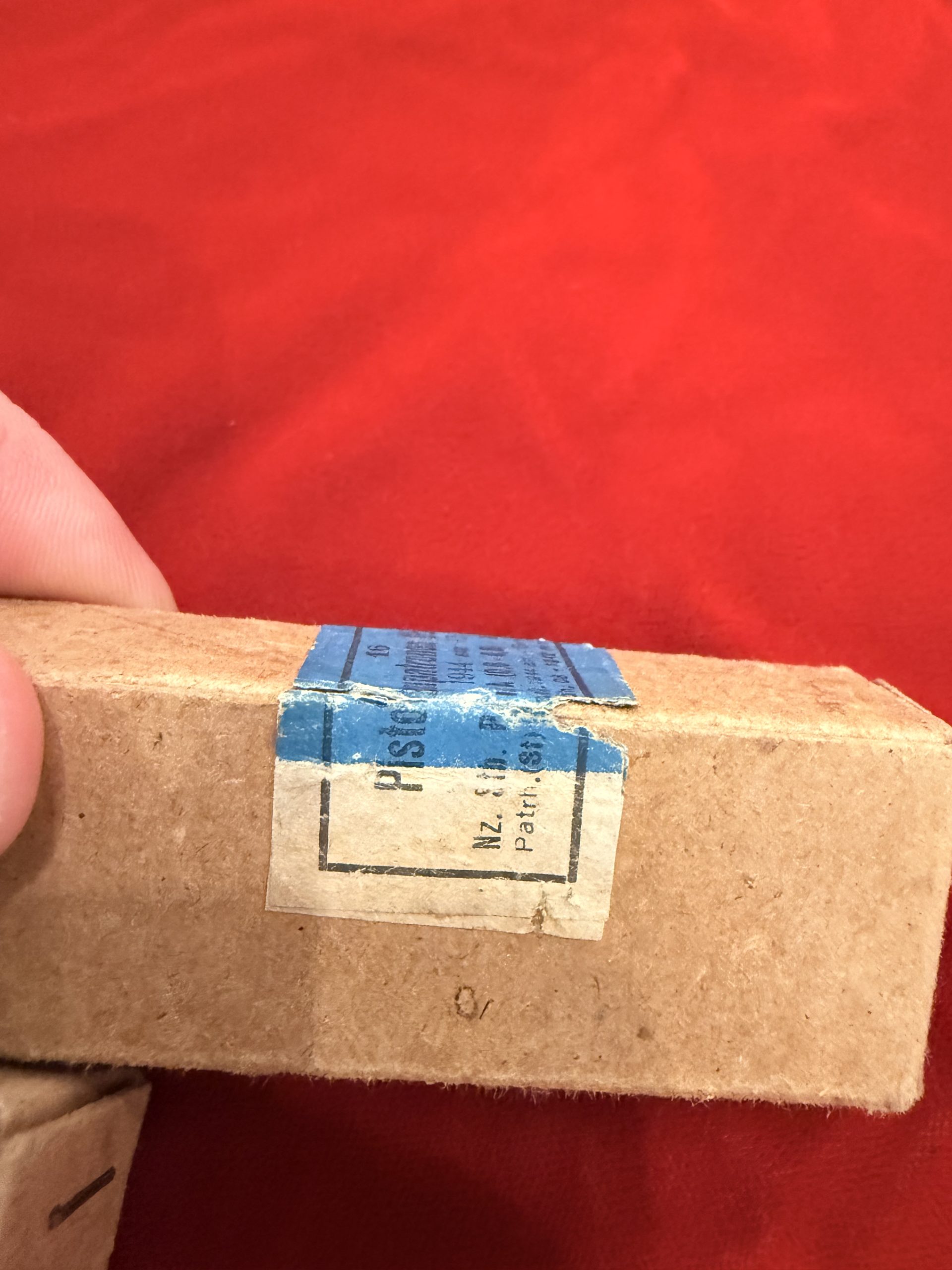 There is some tearing to the paper label sealing the box but the label is still intact across the box seam, meaning the box has remained unopened since packaging in 1944. The cardboard packaging is completely intact and the label is nice and clearly readable. Overall in excellent condition.