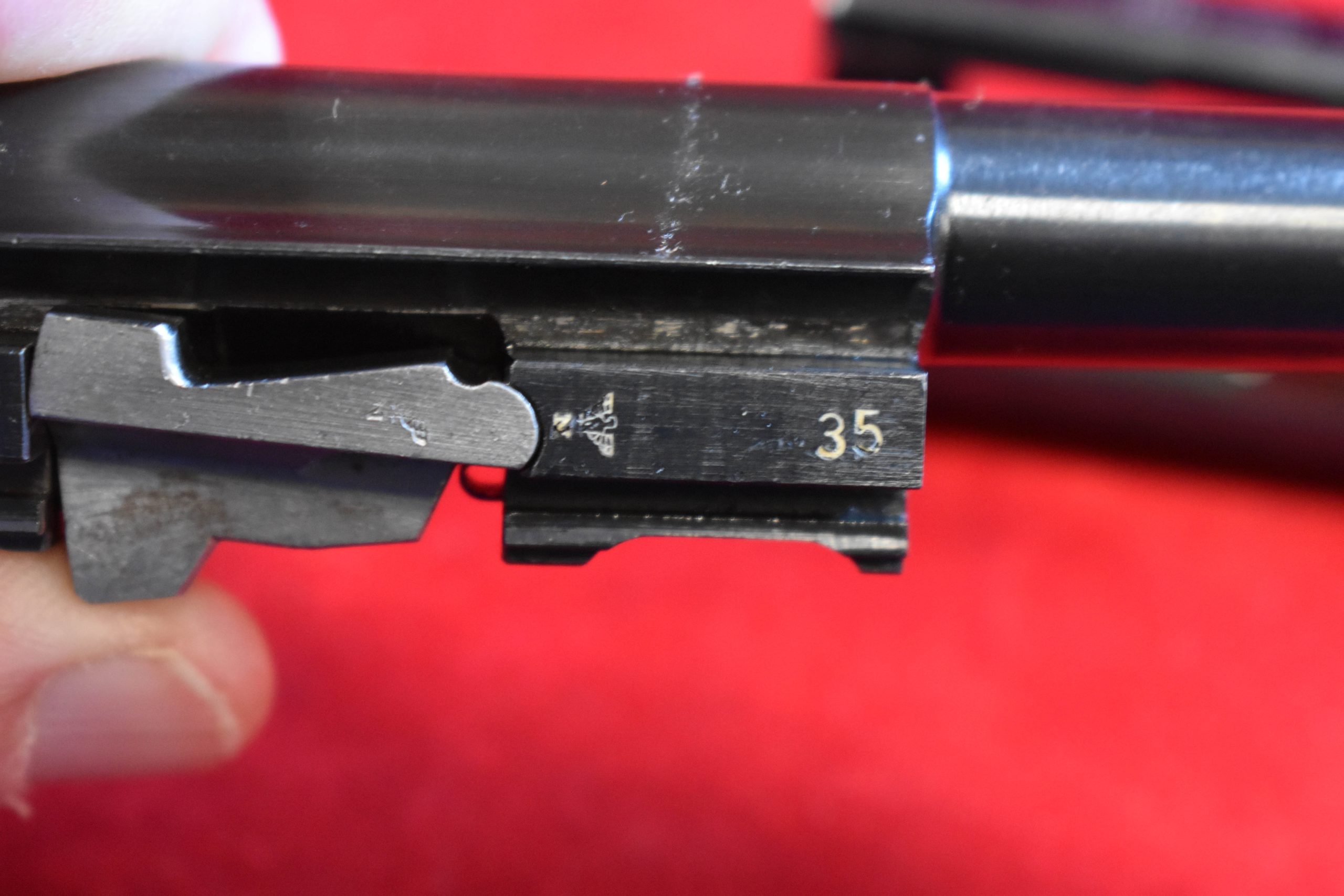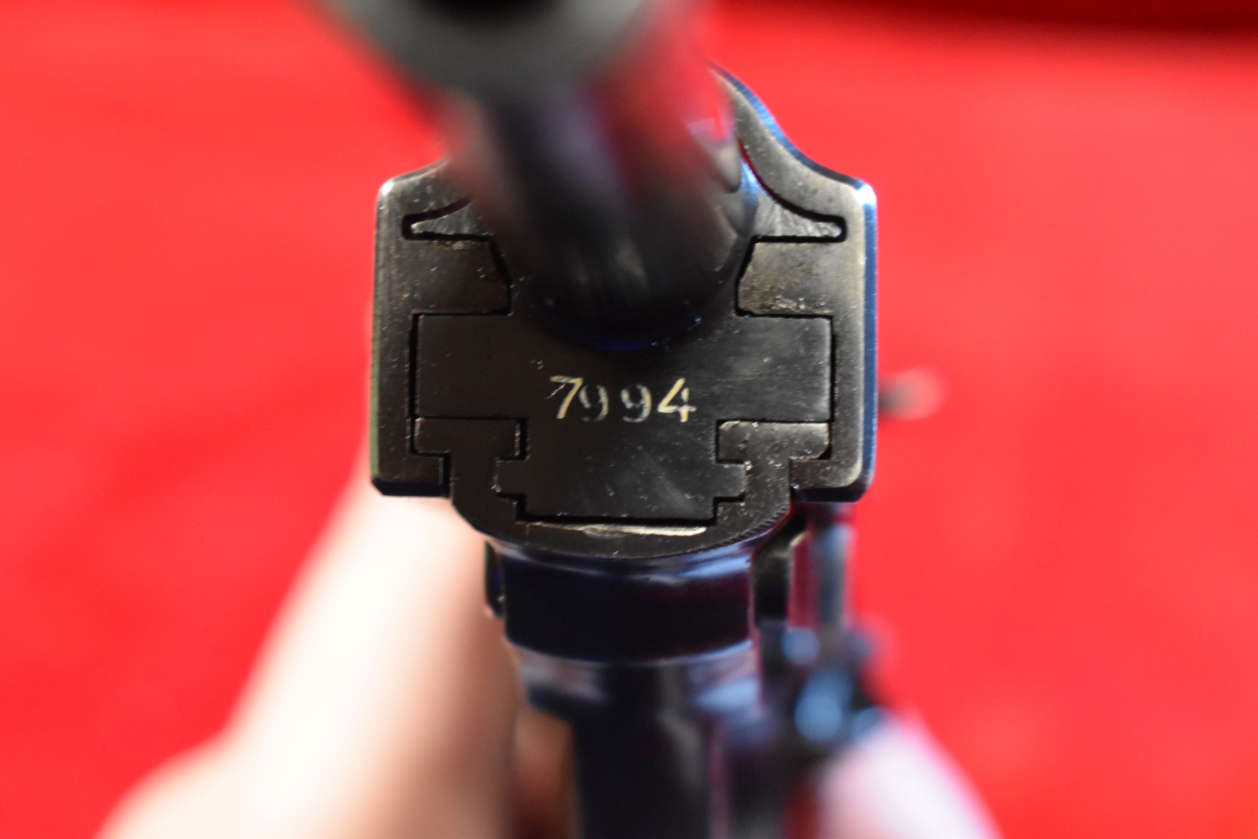 In 98% mint crisp condition, we have a very scarce and seldom seen Walther Heeres Pistole from late 1940. The best part about it is that the very beautiful high grade commercial Walther blued finish is nearly all intact, making for a visually stunning Pistol. The pistol is all matching with a mint bore and it is a textbook example. You will note that it still has the factory original un-marked magazine. This is an extremely rare P.38 Variant that many people will want to have in their collection.