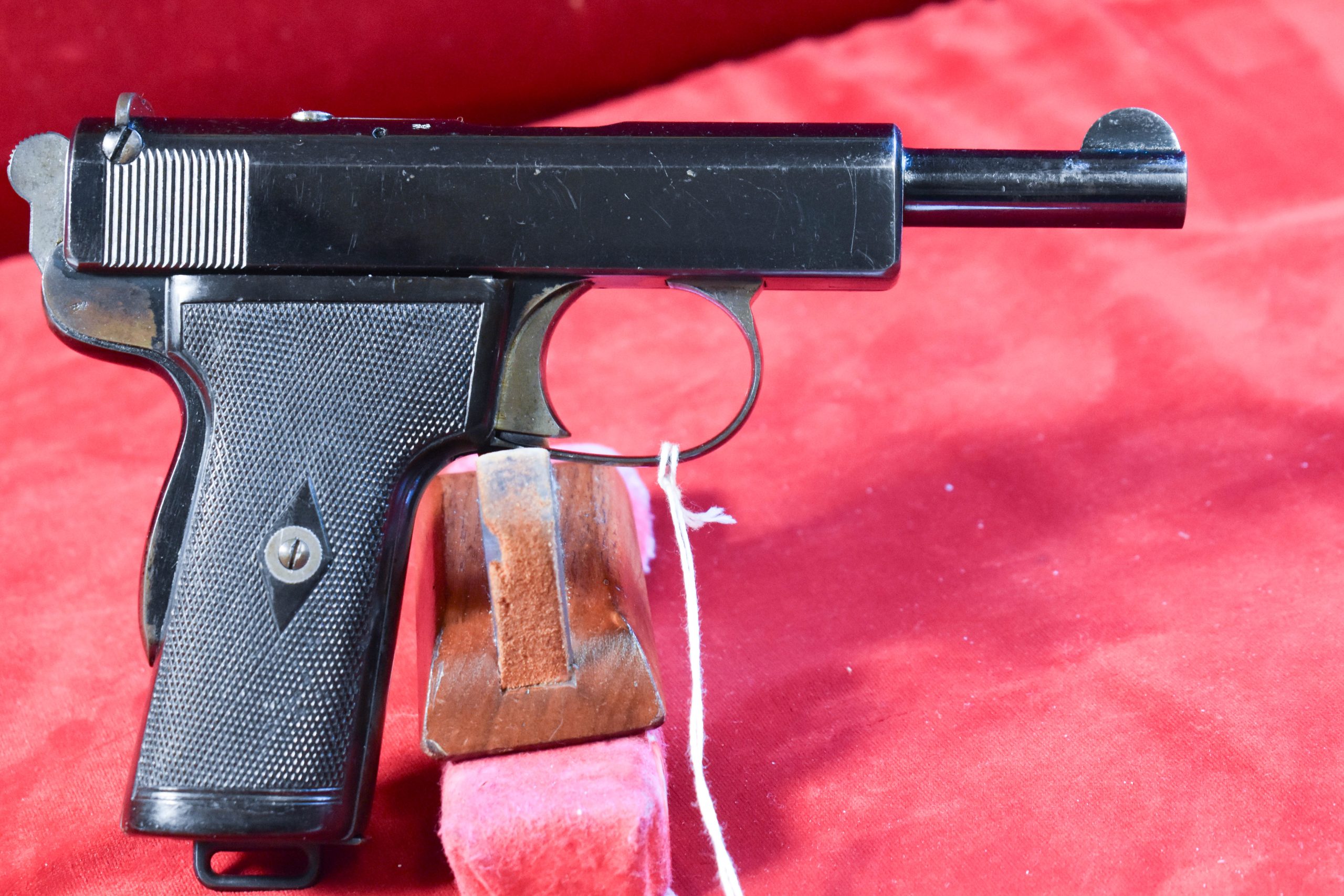 In 95% condition, all matching and original with a mint bore, we have a fairly important and EXTREMELY SCARCE Webley & Scott Model 1909 Automatic pistol in 9mm Browning Long Caliber. This is an intermediate sized pistol compared to the Larger .455 Automatic and the smaller .32 auto variants. Due to the onset of WWI, only around 1650 were produced, THIS PISTOL IS WITH A MILNER LETTER INDICATING IT WAS SHIPPED TO LIEGE 2 MONTHS BEFORE THE OUTBREAK OF WWI, ALMOST CERTAINLY A PRIVATE PURCHASE FOR A BELGIAN ARMY OFFICER.