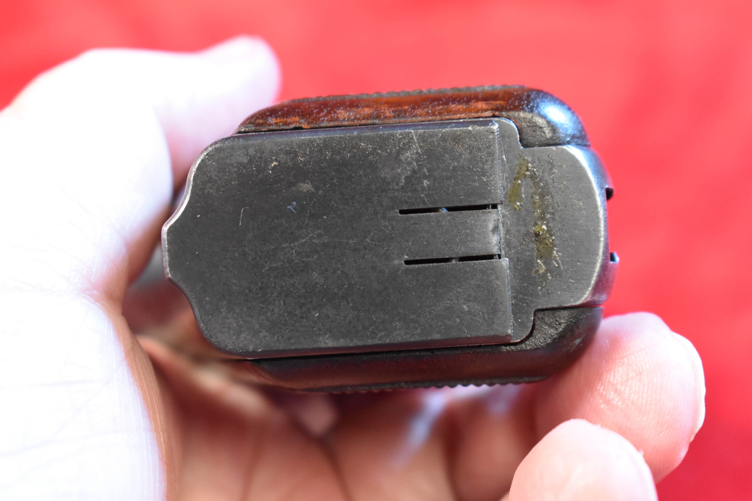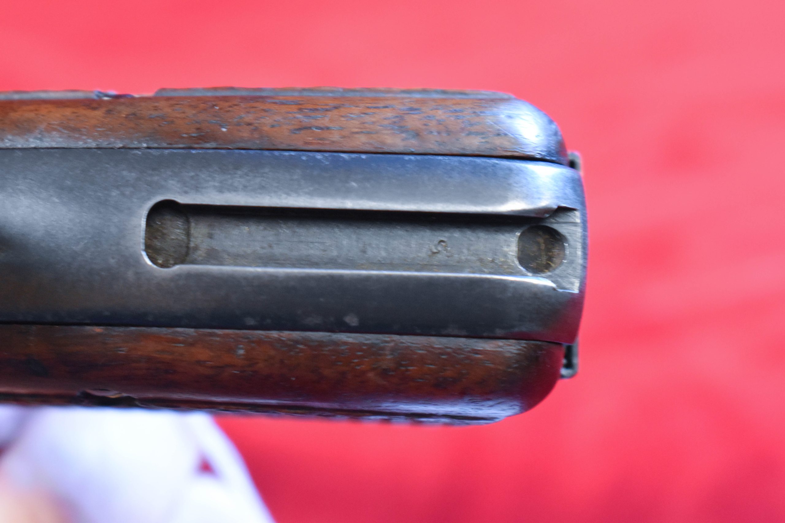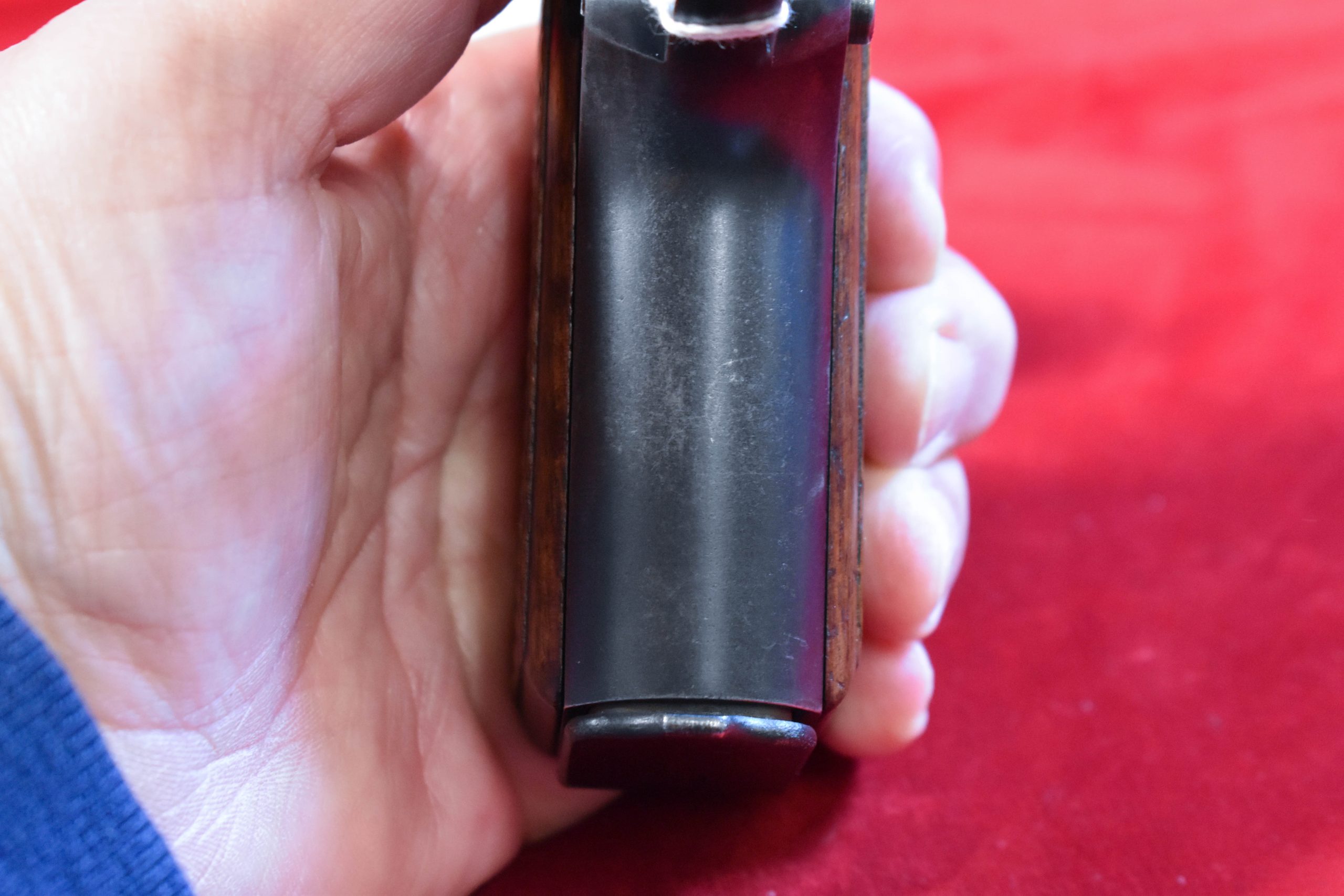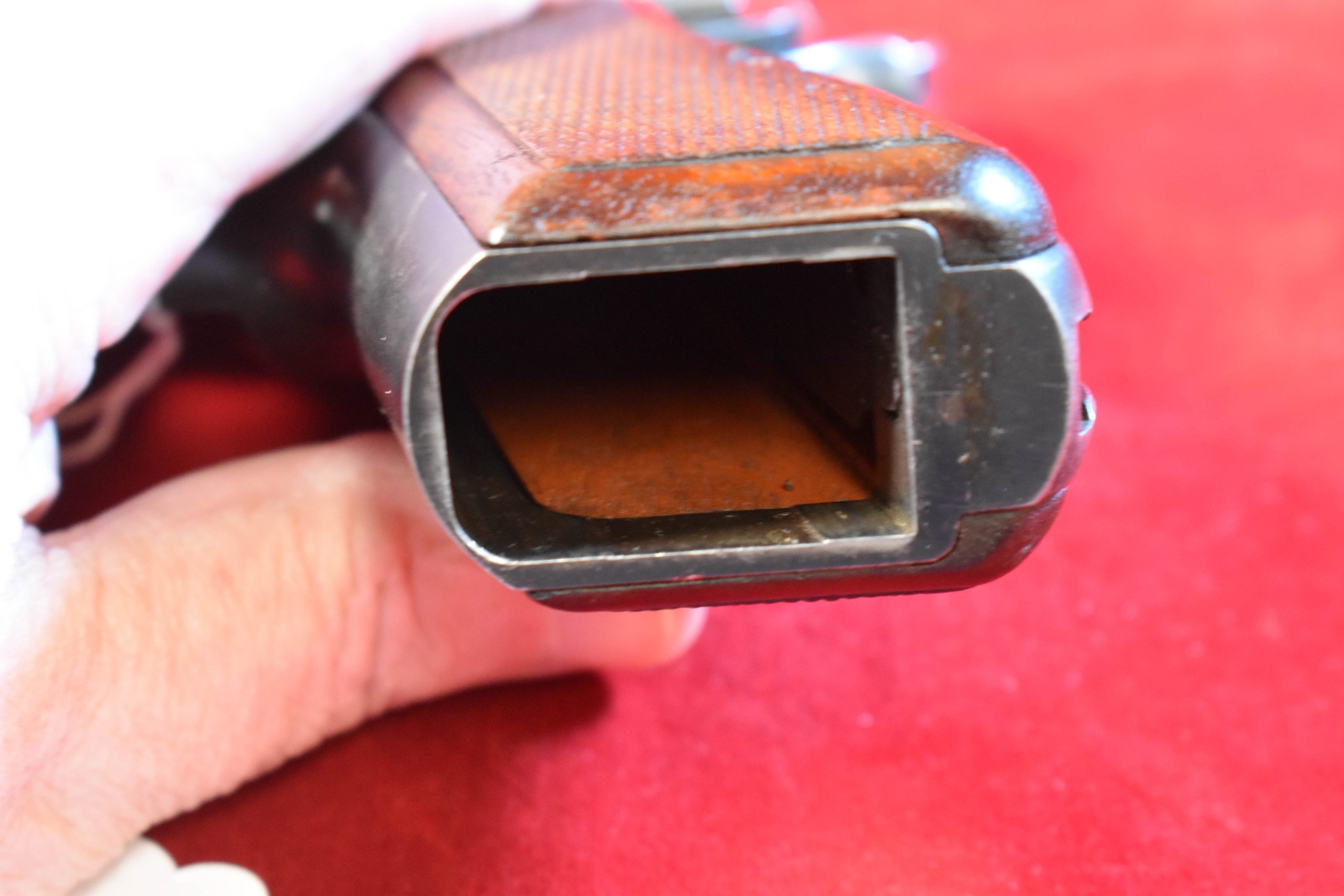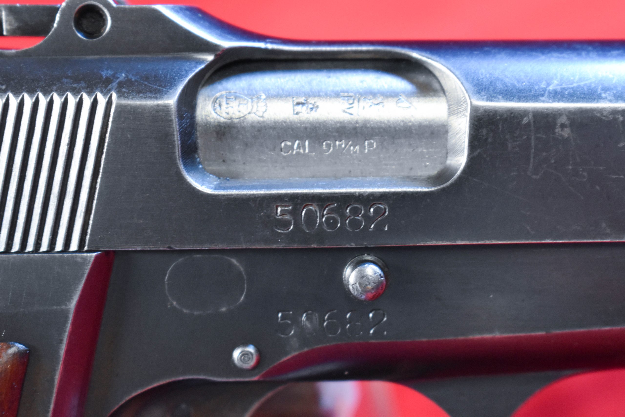 In September of 1940 the German Heeres Waffenamt inspector Tennert arrived at the FN Factory and on assembled pistols such as this he put his WaA613 waffenamt on the triggerguard. Only a few hundred guns were so marked and survivors are extremely rare. The bore is mint and the pistol is totally matching and factory original. It has the correct pre-war pale red painted grips, and the correct original WaA613 marked magazine as well. At most there may have been a few hundred of these made, but only a handful survived the war and relatively few of those as intact as this example. This is one of the most sought-after German WWII pistols and a premier example as well.