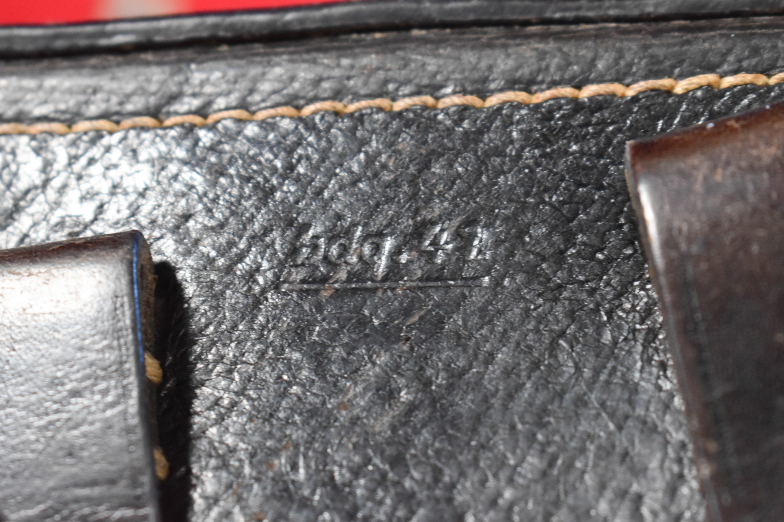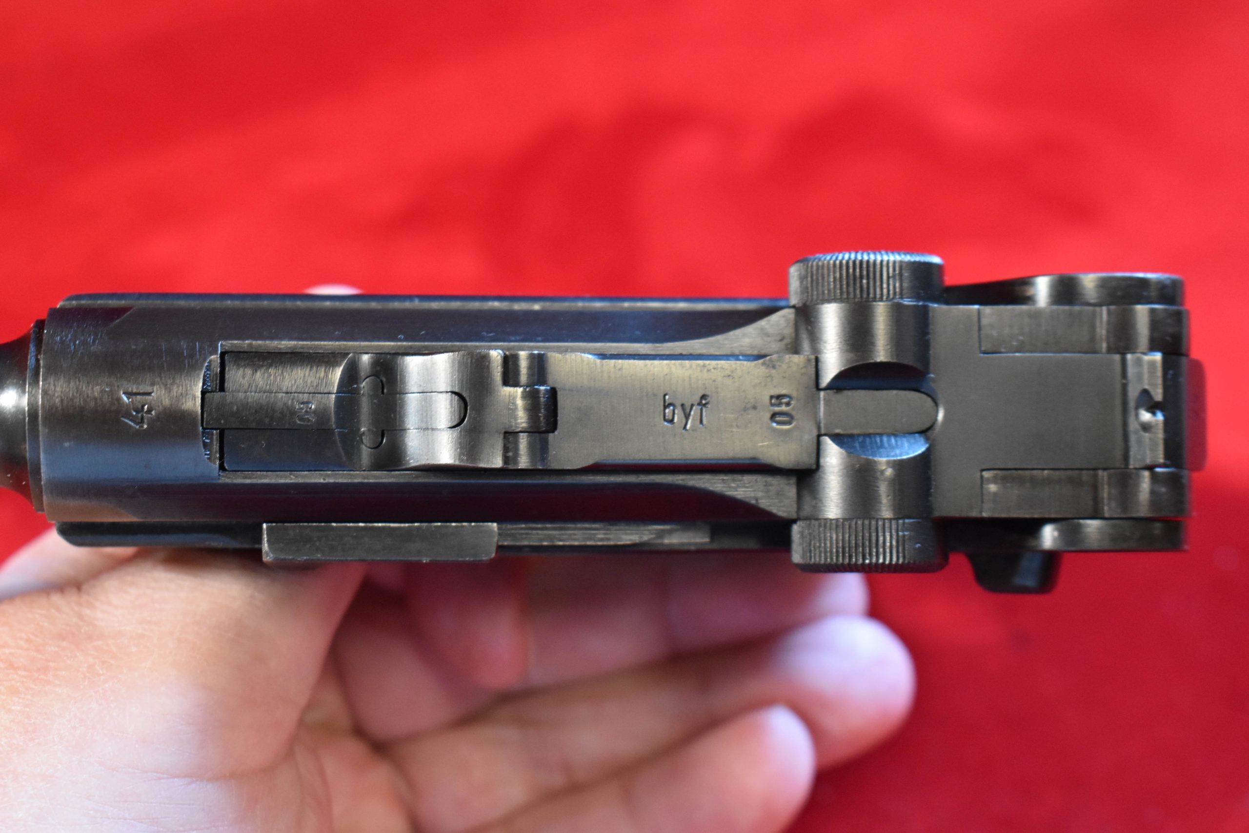In 96-97% very sharp all matching condition, we have a top shelf example of a Mauser Made byf 41 Code P.08 Luger fully rigged out with an extremely desirable & scarce bdq 41 Coded RARE MAKER (Ehrhardt & Kirsten, Leipzig) Black Pigskin Holster, the Eagle/655 loading tool and extra mag. This was a WWII vet bring back that just came out of a gulf coast collection and is almost certain to be factory original as issued. This Luger is an original totally matching textbook example with a mint bore as well.