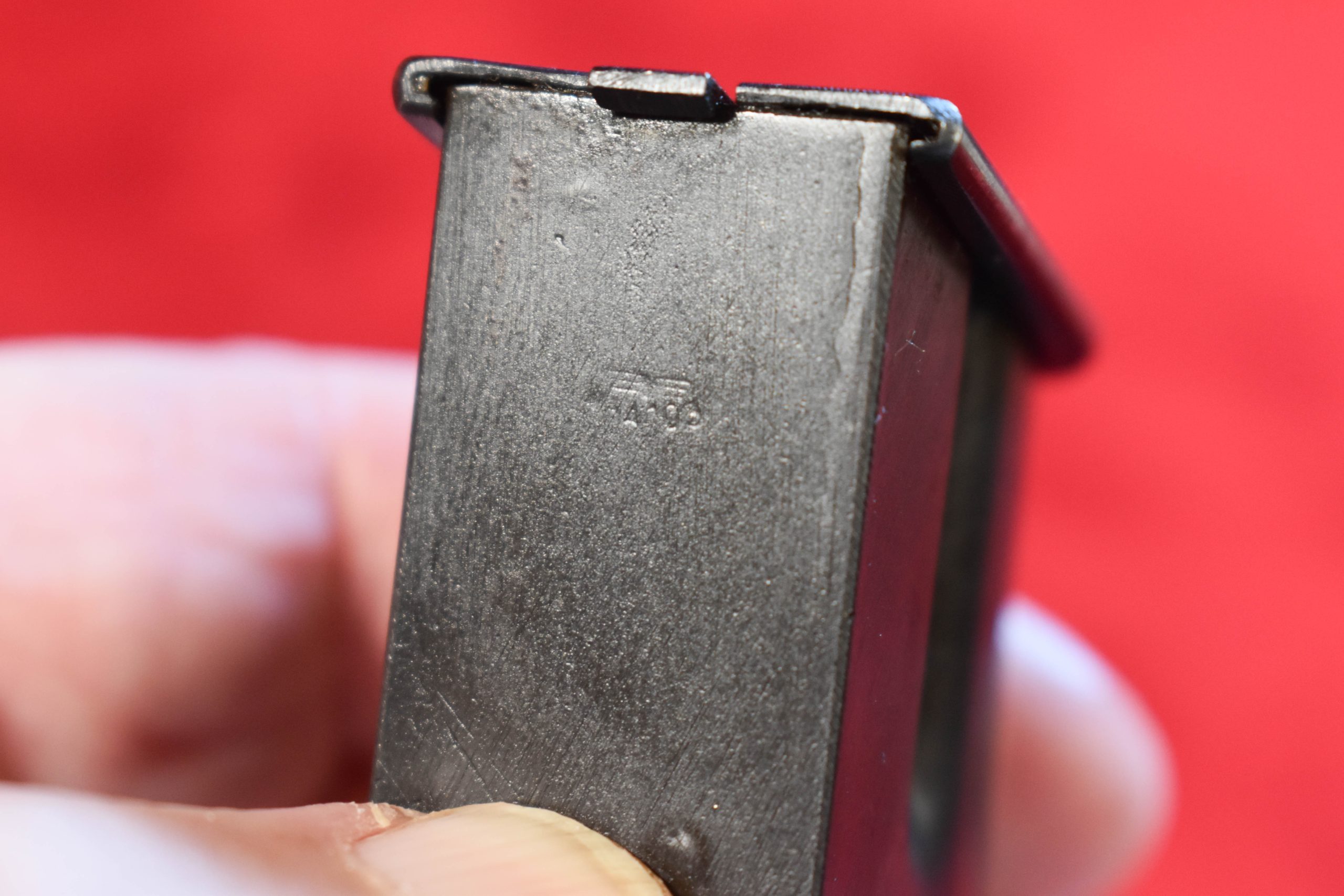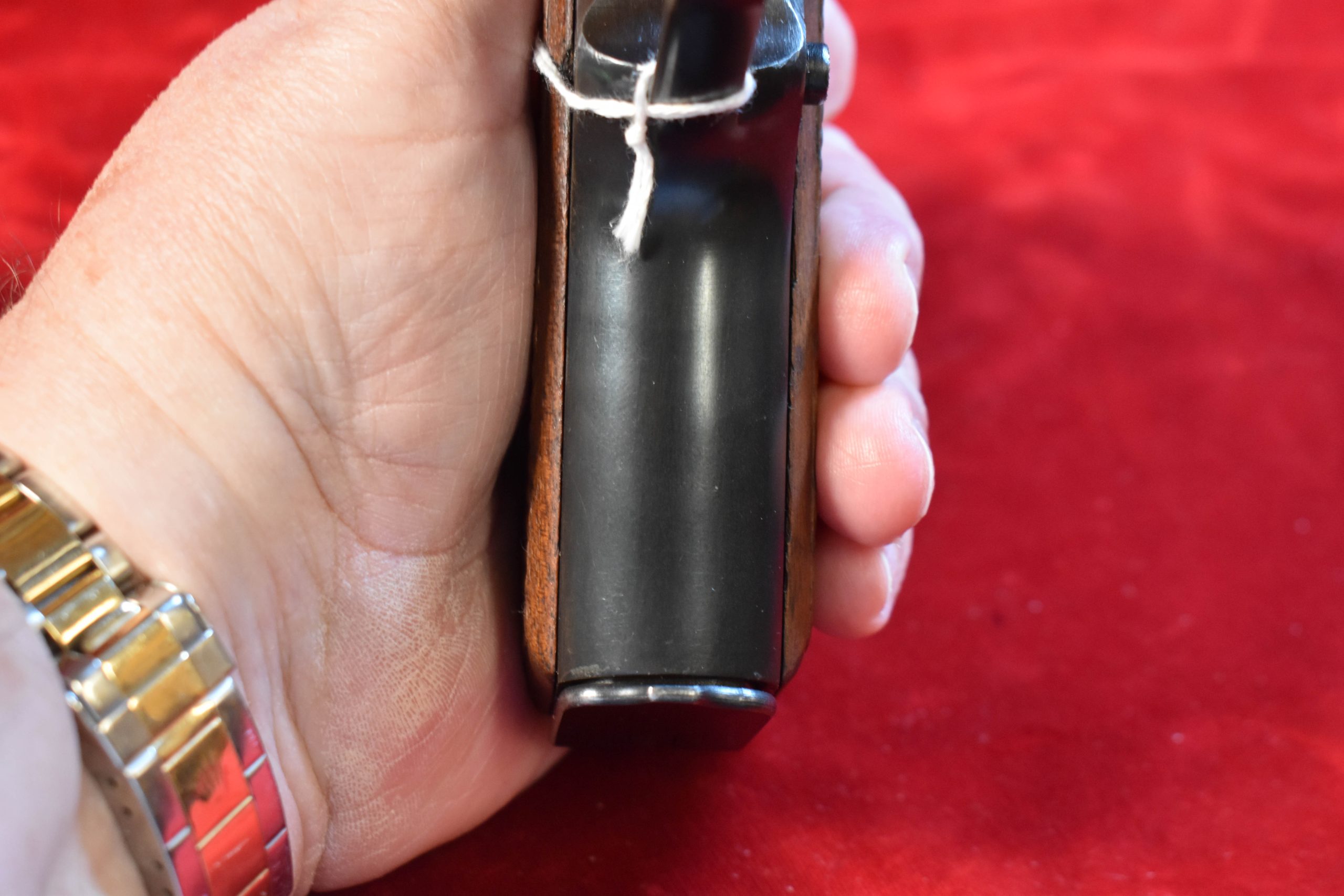 In 98% mint crisp eye-popping condition, we have a very rare and important Nazi Occupation June 1941 production tangent sight FN High Power Pistol. This pistol was made at the time the primary FN Plant HeeresWaffenamt Chief Inspector’s code was WaA103. This pistol has the WaA103 proofed factory original mag. The pistol is totally matching, factory original and the bore is mint. This is an important very early Nazi occupation High Power rig exactly as it left the factory and was vet brought back. As such it would be a great piece for the serious High Power or Nazi pistol collector. Finding a high power this crisp is not an easy thing to do.