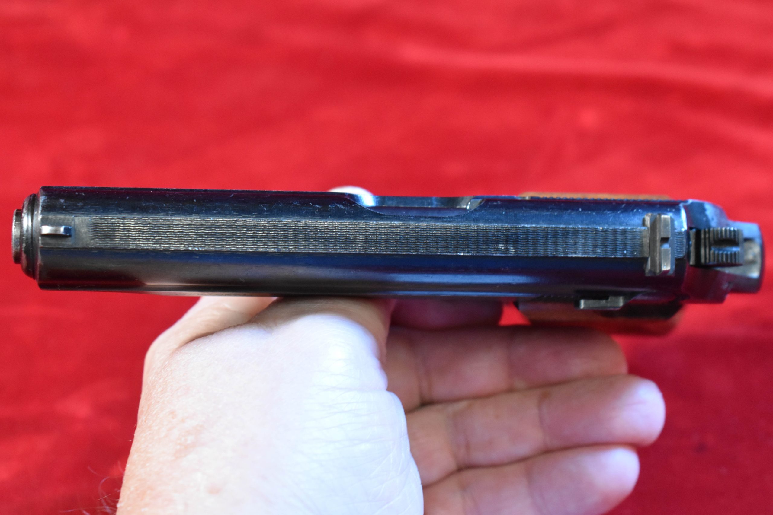 In 97+% very crisp condition, we have a top example of a German WWII Army issued Military Finish WaA359 Waffenamted Walther PP Pistol with the scarce & highly desirable pressed wood grips. This is a late 1944 production pistol with the signal pin. This version of the PP is referred to by collectors as Variation 4 and it is estimated that 66,000 were produced making this the most widely produced German made 7.65mm pistol of the war. The pistol is all matching with a mint bore. This is a must have pistol for any serious Walther or German WWII pistol collector!