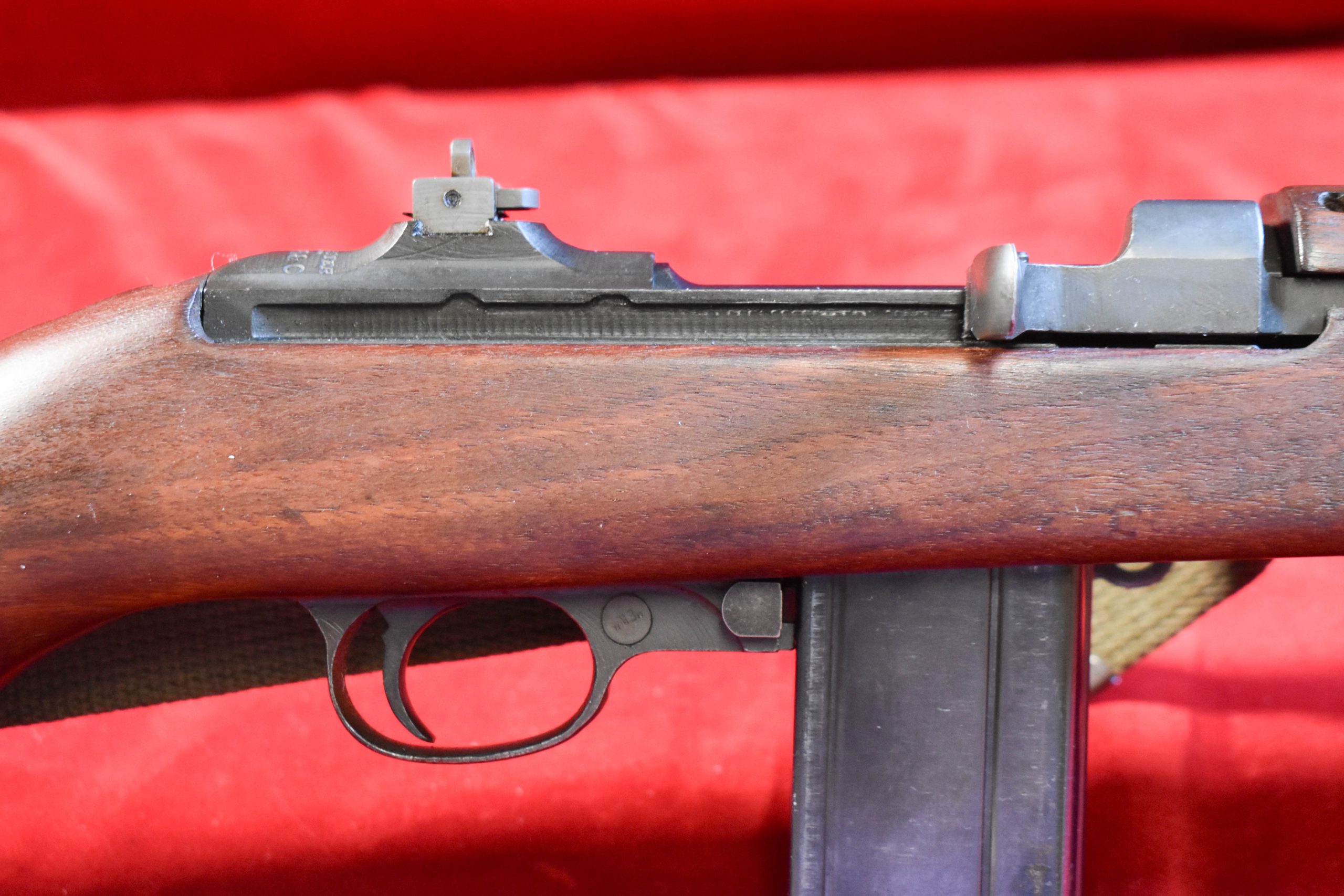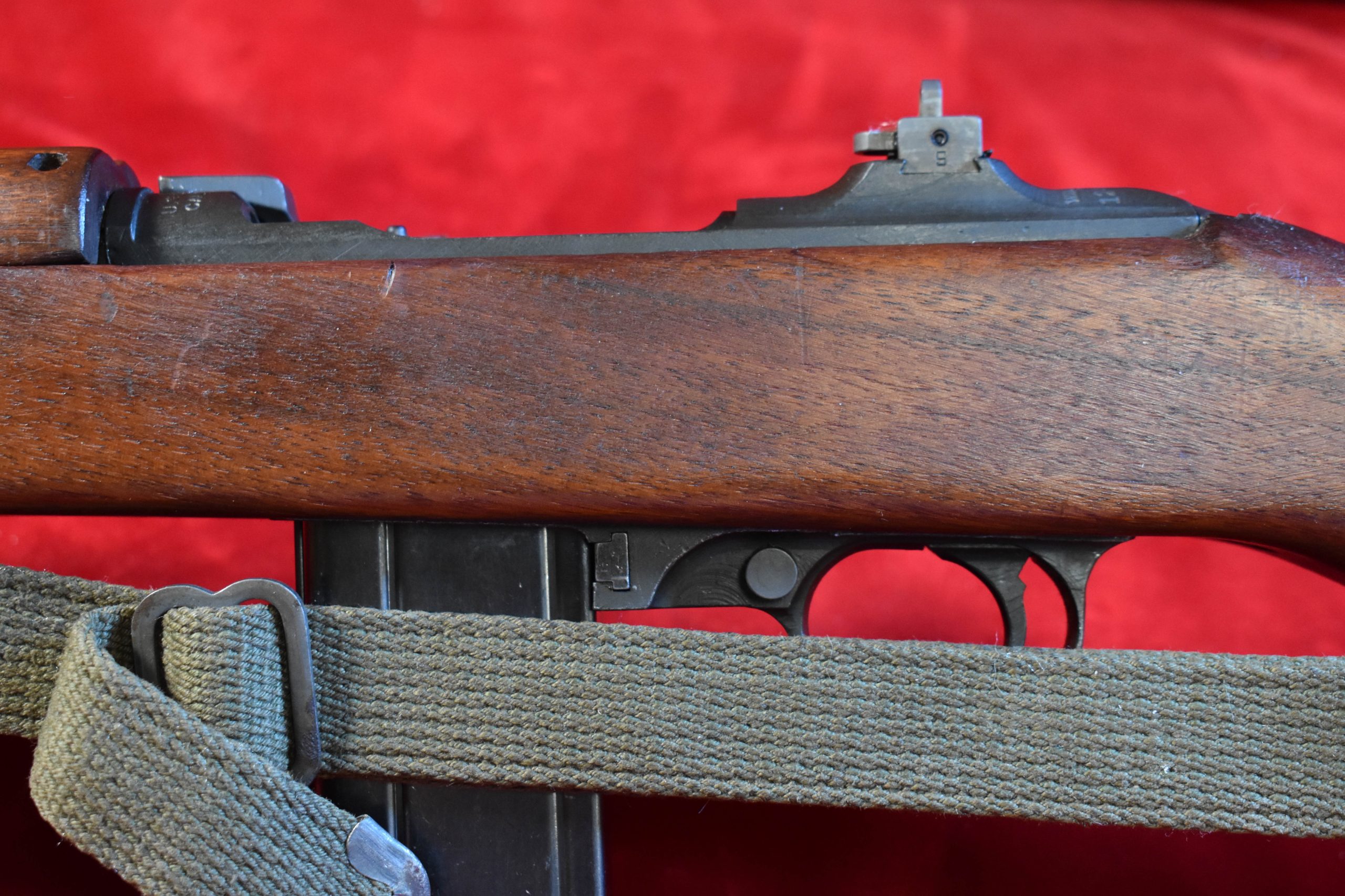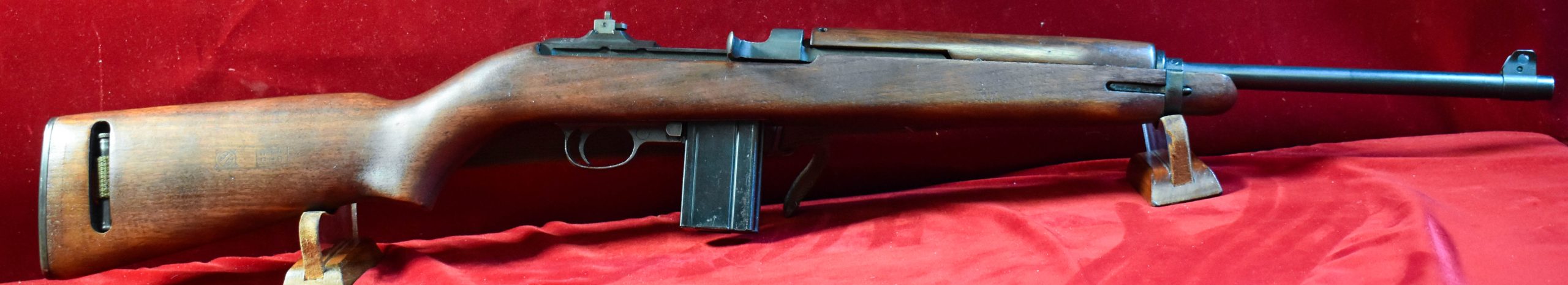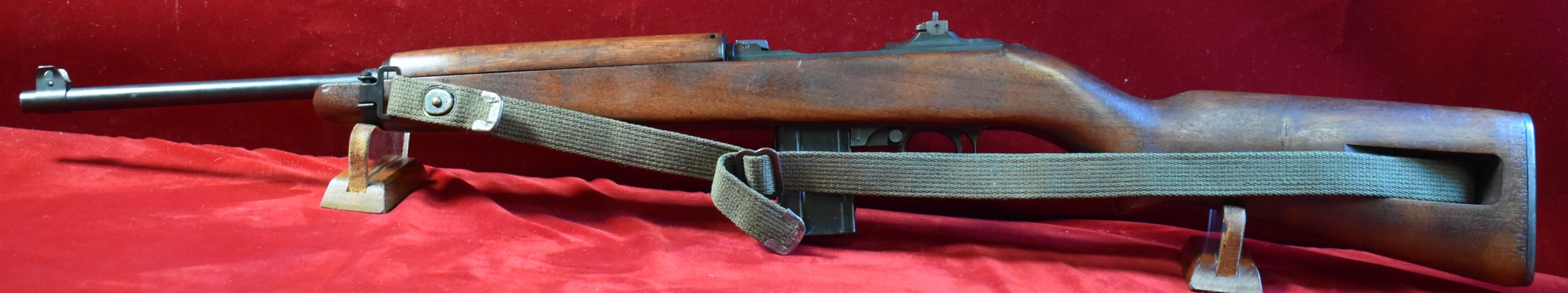 One of the nicest Winchester made carbines that we have handled in the last couple of years, here’s a fantastic textbook Winchester M1 Carbine that was manufactured in May, 1943. This is a late first contract example that is 100% factory original. It has the high wood stock with a cartouche is very crisp and clear. Also has the original C-tip sling with oiler, period correct WWII!